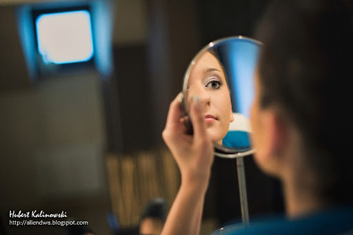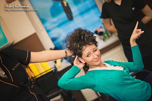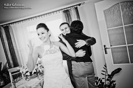 Z Moniką i jej siostrą (świadkową) umówiłem się przy stacji benzynowej. Czekając udałem się do tamtejszego sklepiku, żeby kupić coś na rozbudzenie. Deszcz w dalszym ciągu siąpił, było zimno, ciemno… Coś okropnego. W pewnym momencie podjeżdża samochód. Jego wycieraczki równomiernie i cyklicznie przecierały mokre szyby. Światła rozświetlały mroczne i deszczowe ciemności tamtego poranka. Drzwi otworzyły się z impetem i wyskoczyła z nich rozpromieniona Monika. „Pada deszcz!” – krzyknęła mi na powitanie. „Ale to mnie wcale nie obchodzi, bo dzisiaj wychodzę za mąż!” W tym momencie dla mnie deszcz już nie istniał i pomimo panujących ciemności, w duszy świeciło mi słońce. Monika okazała się lekiem na całe zło, które mnie wtedy nawiedziło. Wraz z jej siostrą pojechaliśmy do fryzjera, który był moim pierwszym punktem dokumentowania ślubnego dnia Moniki i Janusza.