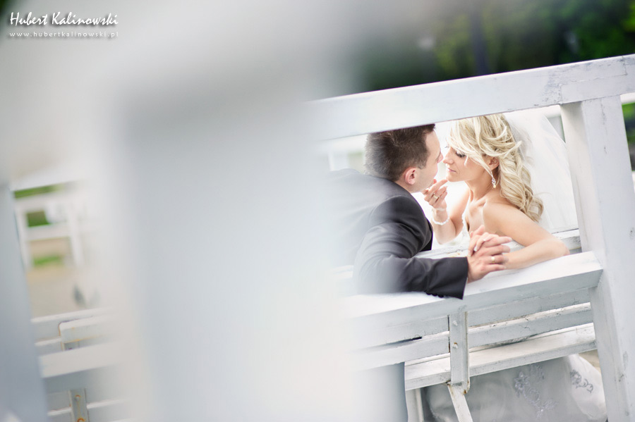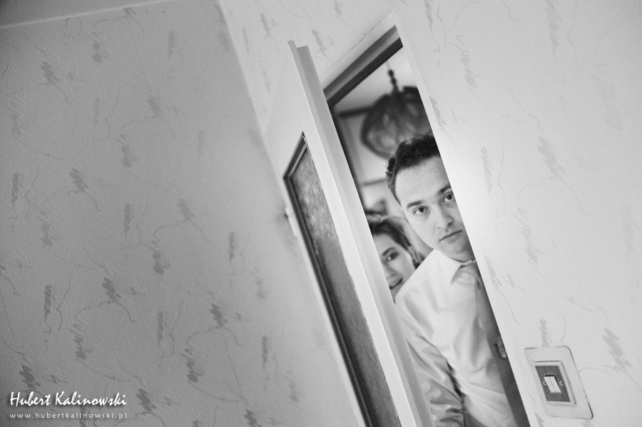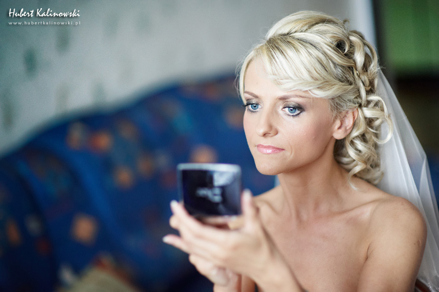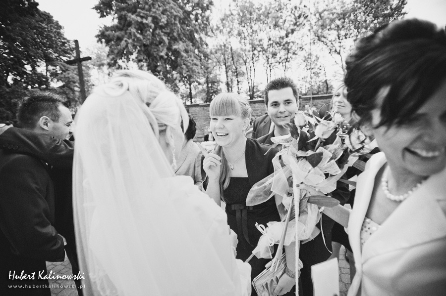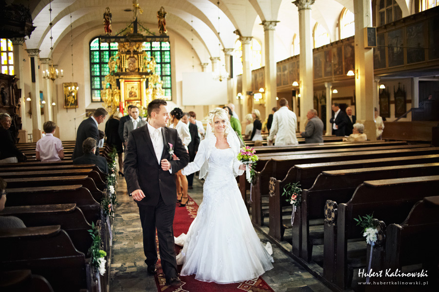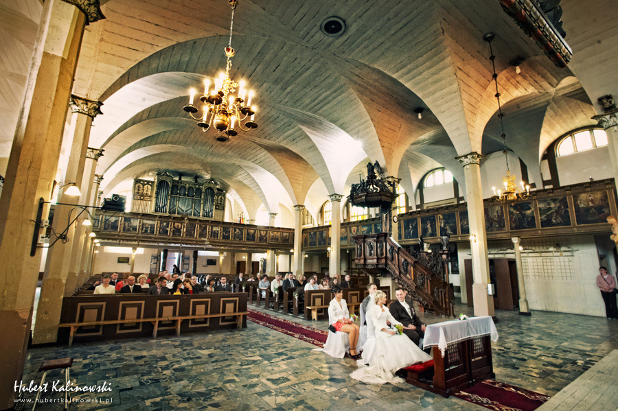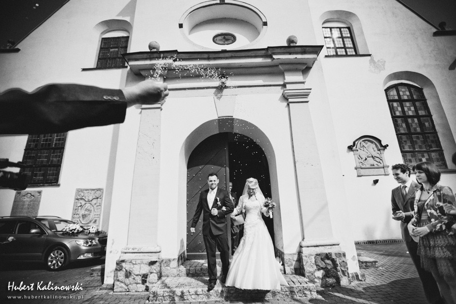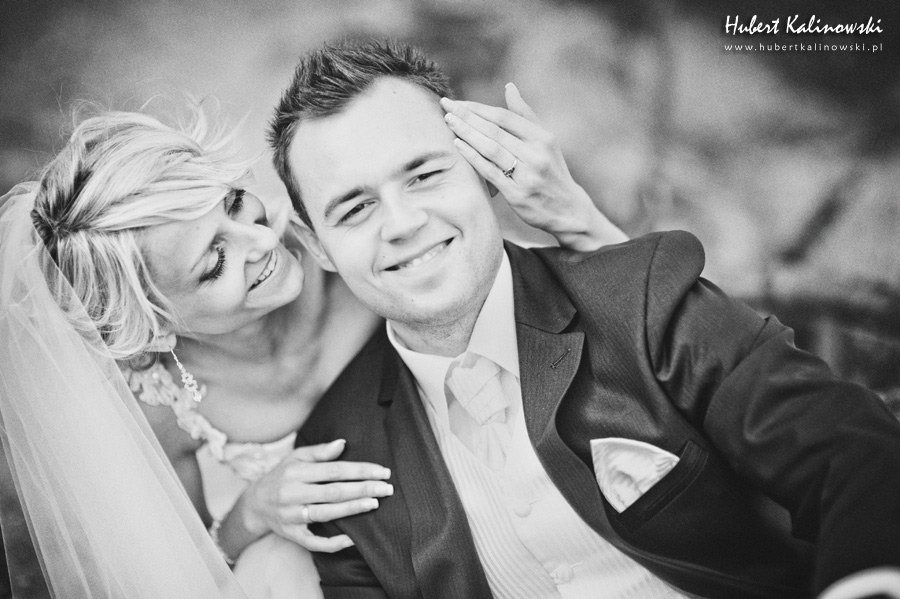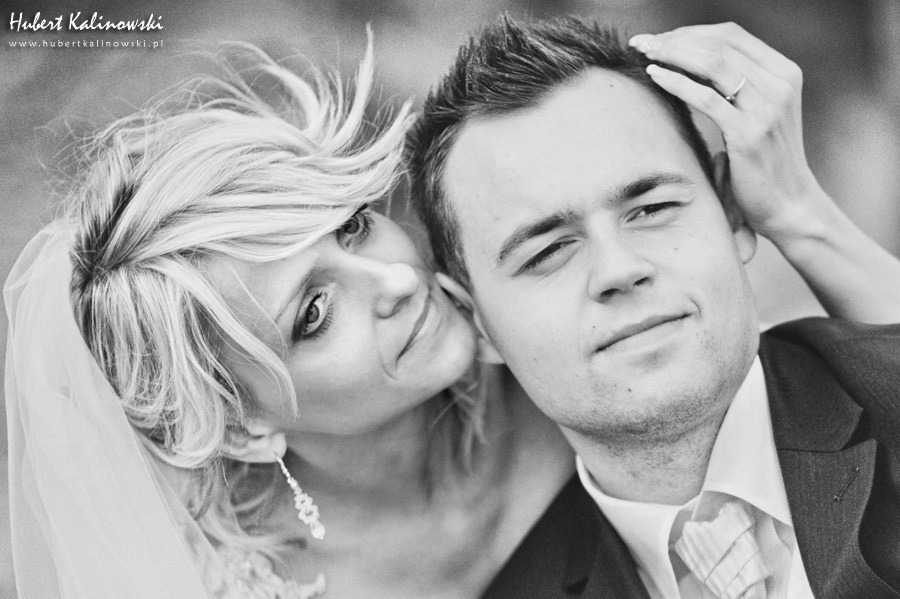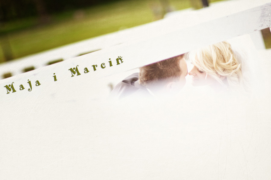 Maja i Marcin – kolejna fajna para 🙂 Pamiętam ten dzień. To była końcówka maja. Piękny słoneczny dzień. Czuło się na twarzy łaskotanie promieni słonecznych, delikatnie grzejących skórę. Ech… Miło tak powspominać, kiedy za oknem szaro, lekko siąpi deszcz, a chodzenie w koszulce na krótki rękaw spotyka się z pukaniem w czoło przez przypadkowo spotkane osoby. Pamiętam tą zdrową, ale i sympatyczną nerwówkę w mieszkaniu podczas przygotowań. Z minuty na minutę robiło się coraz ciaśniej i coraz więcej gości 🙂 To ktoś zaglądał przez lekko niedomknięte drzwi, to gwizdał czajnik z gotującą się wodą na kawę, to znowu dzwonek do drzwi, okupowana łazienka, przeciskania się ludzi w przedpokoju 🙂 Było fajnie. Sporo się działo. Wspominam też bardzo oryginalny, klimatyczny  kościół, oraz wesele w drewniano-murowanej klimatycznej sali… Pamiętam też plener. Zachmurzone lekko niebo gwałtownie przerodziło się w ulewę, która popsuła nam szyki. Dobrze, że znaleźliśmy jakieś zastępstwo w postaci pomieszczenia z dachem 🙂