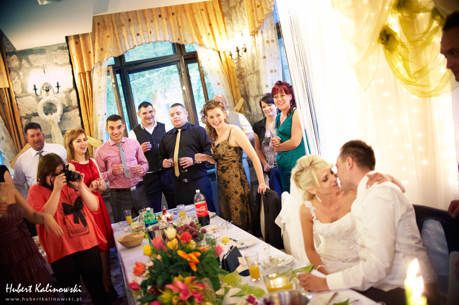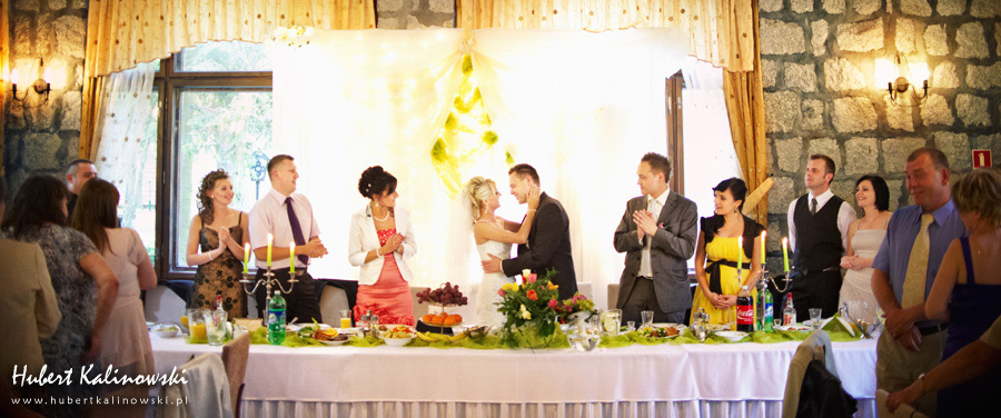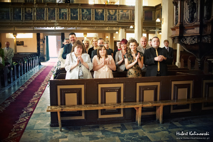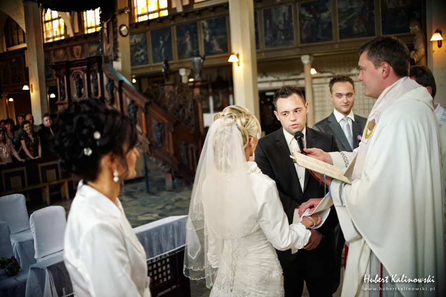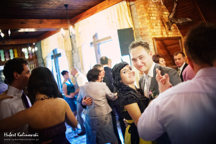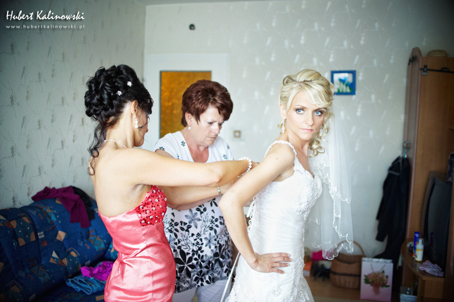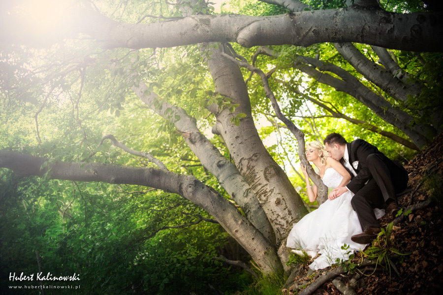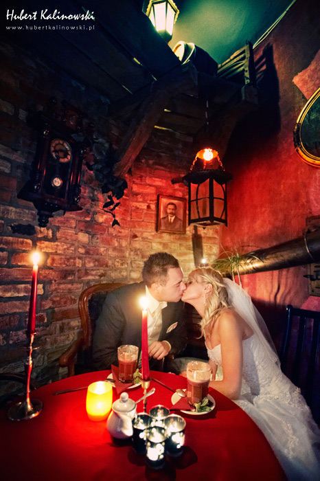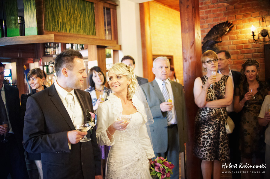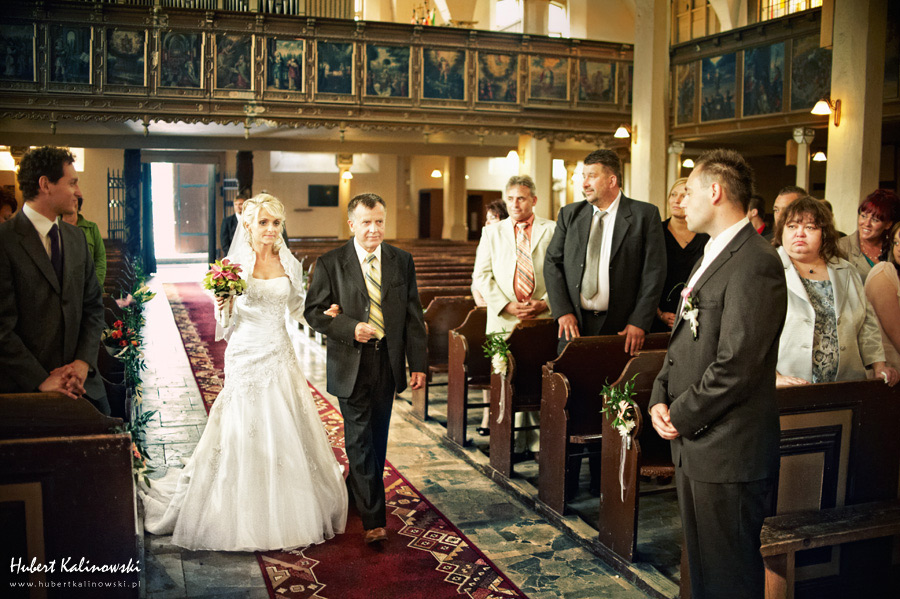 Maja i Marcin – kolejna fajna para 🙂 Pamiętam ten dzień. To była końcówka maja. Piękny słoneczny dzień. Czuło się na twarzy łaskotanie promieni słonecznych, delikatnie grzejących skórę. Ech… Miło tak powspominać, kiedy za oknem szaro, lekko siąpi deszcz, a chodzenie w koszulce na krótki rękaw spotyka się z pukaniem w czoło przez przypadkowo spotkane osoby. Pamiętam tą zdrową, ale i sympatyczną nerwówkę w mieszkaniu podczas przygotowań. Z minuty na minutę robiło się coraz ciaśniej i coraz więcej gości 🙂 To ktoś zaglądał przez lekko niedomknięte drzwi, to gwizdał czajnik z gotującą się wodą na kawę, to znowu dzwonek do drzwi, okupowana łazienka, przeciskania się ludzi w przedpokoju 🙂 Było fajnie. Sporo się działo. Wspominam też bardzo oryginalny, klimatyczny  kościół, oraz wesele w drewniano-murowanej klimatycznej sali… Pamiętam też plener. Zachmurzone lekko niebo gwałtownie przerodziło się w ulewę, która popsuła nam szyki. Dobrze, że znaleźliśmy jakieś zastępstwo w postaci pomieszczenia z dachem 🙂