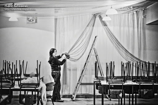 Miesiąc temu miałem przyjemność być na ślubie mojego kolegi. Jednakże po raz pierwszy w innej roli. Byłem świadkiem. To było dla mnie całkiem nowe doświadczenie i olbrzymi stres. Ciągle powtarzałem żonie, że wolałbym fotografować, ponieważ w tym czuję się pewniej niż w świadkowaniu 🙂 Dodatkowo, moja żona zobowiązała się udekorować salę weselną, kościół, samochód, zrobić bukiet dla Młodej oraz świadkowej i butonierki dla Młodego i świadka (czyli mnie). Nie byłbym sobą gdybym nie zabrał aparatu. Fajnie jest fotografować mając na uwadze to, że nie trzeba się martwić, iż jest się wynajętym fotografem. Mogłem sobie potestować nowe ustawienia, poeksperymentować, bez strachu, że podczas takich eksperymentów coś mi nie wyjdzie. Jako, że nie chciałem wchodzić w drogę wynajętemu fotografowi, trzymałem się na uboczu. Poniżej kilka zdjęć z mojego bezstresowego fotografowania.